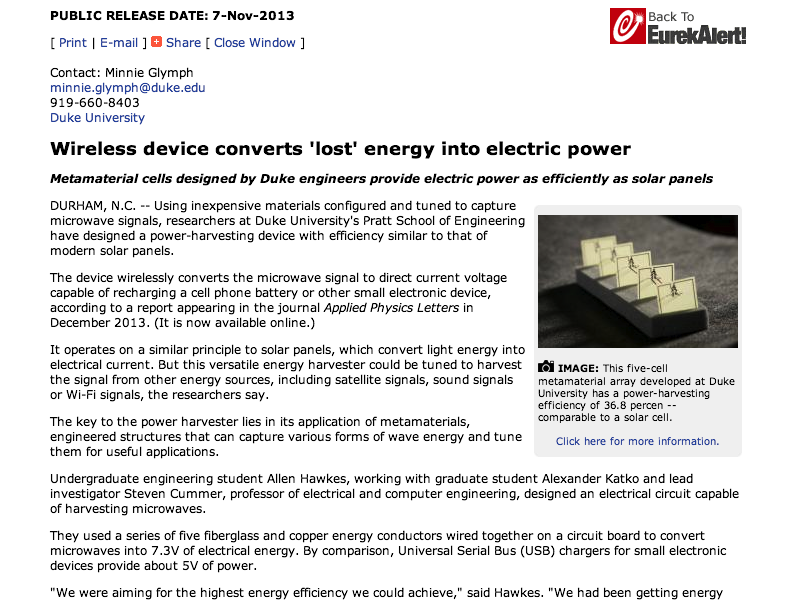 Investors with foresight may consider this new Invention, by Duke University,  for appropriate funding. The Meta-Materials used may be suitable for other applications as well. Monetary funding combined with Ingenuity can prevail in new Energy Recovery Technologies.