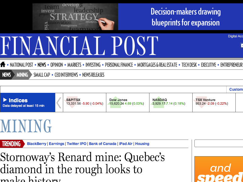 News Analysis: Quebec Government leaders are being wise in cooperating in infrastructure development towards this large Diamond Mine Project. Since the bulk of the diamonds test as ‘Gemstone’ Quality, tax remunerations to Quebec can be expected to be significant.