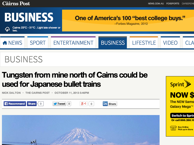 News Analysis: A Memorandum Of Understanding (MOU) has been signed by Japanese Business Interests and the Queensland Government. Acquisition of Tungsten Concentrate, from a large mining operation north of Cairns, Australia, is sought for High-Speed Rail in Japan. Already, personnel are being hired in anticipation of commencing production for the Japanese.