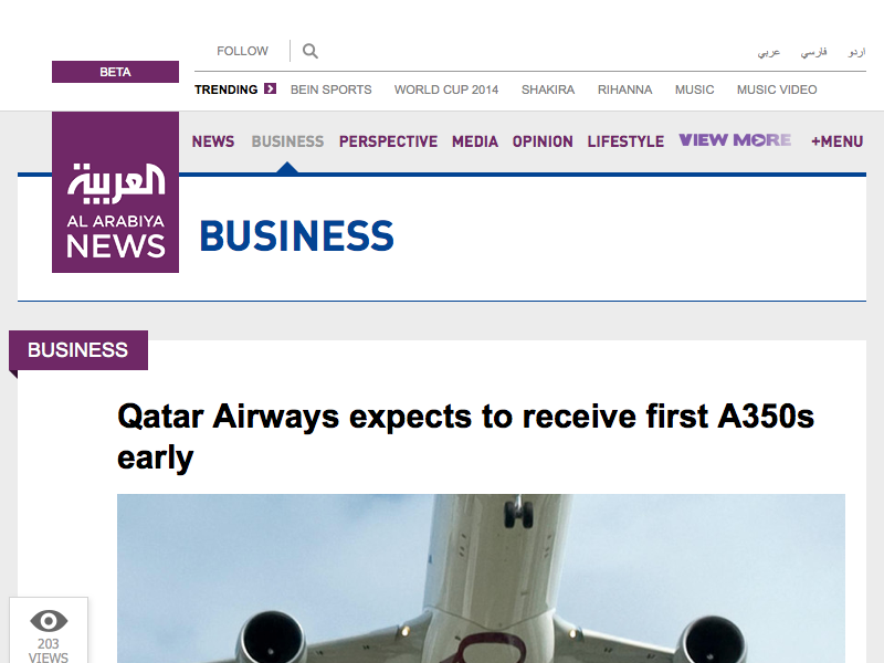 Reference: http://english.alarabiya.net/en/business/2014/02/12/Qatar-Airways-expects-to-receive-first-A350s-early.html