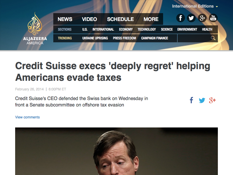 Reference: http://america.aljazeera.com/articles/2014/2/26/credit-suisse-execsdeeplyregrethelpingamericansevadetaxes.html