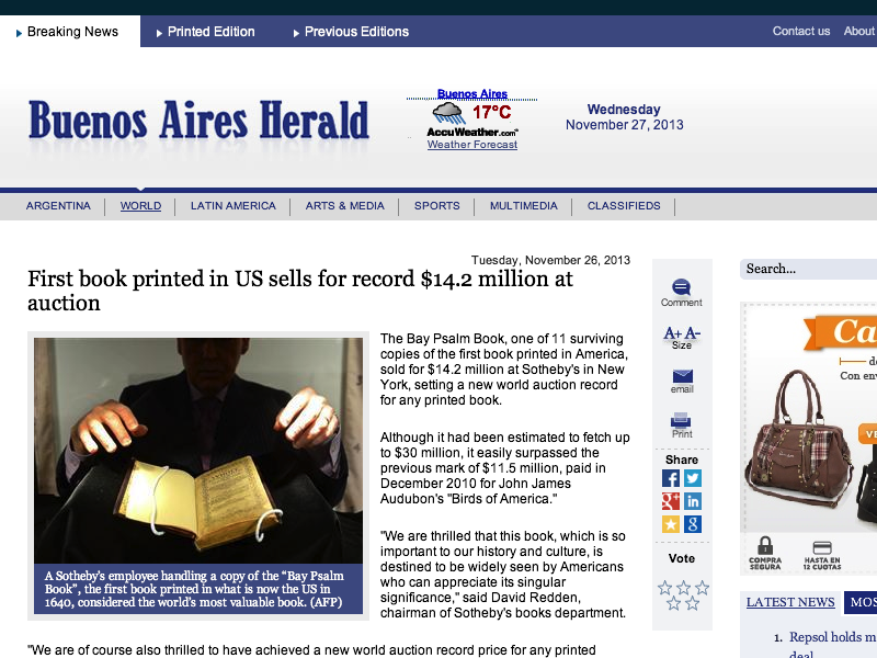 Bay Psalm Book, One of World’s Rarest, Sells for $14.2 Million