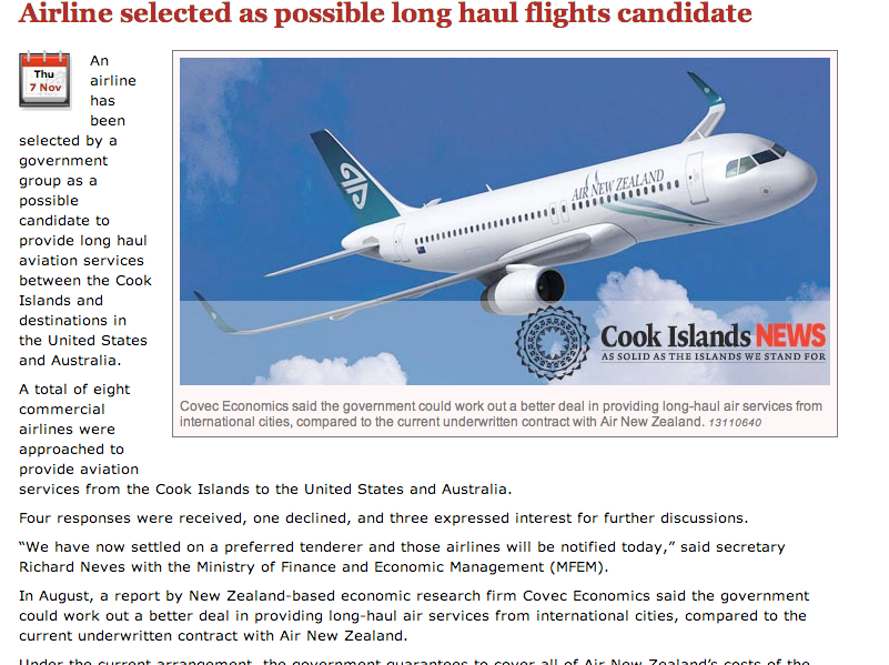 News Analysis:  Cook Islands Seeks Inter-Continental Jet Service For Its Economic Growth through an Airline Tender. Since it is located Half-Way between the Hawaiian Islands and New Zealand, travel by Jet Aircraft is most expedient. A Government Subsidy for travel to Los Angeles, California, is a present reality. An Airline wanting to expand itself into the Pacific may want to  consider these Islands.