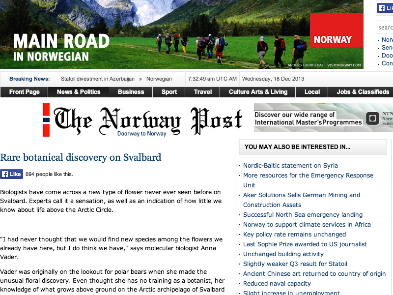 News Analysis: Norwegian Discovers Unknown Flower Species while investigating above the Arctic Circle. The Molecular Biologist happened upon the flower during her expedition on the Archipelago of Svalbard. The portion of the Archipelago is described as a “Botanical Oasis”; It contains Heather and plants rather than being rather void of flora like other areas. The lack of snow in the area made the Discovery possible.