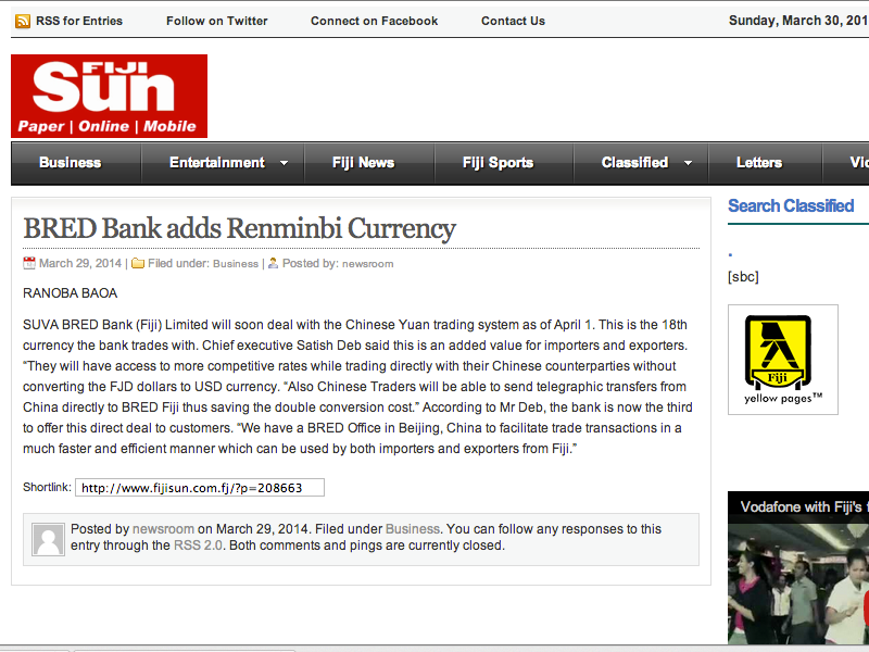 Reference: http://www.fijisun.com.fj/2014/03/29/bred-bank-adds-renminbi-currency/
