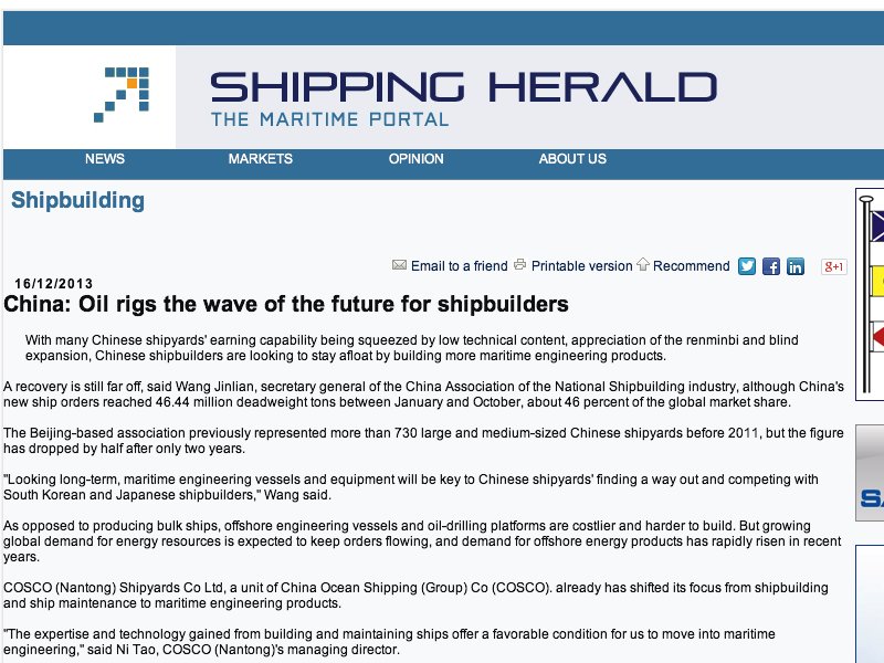 News Analysis: Chinese Shipyards Look To Research And Development In Off-Shore Oil Rig Fabrications; this, to meet or exceed such manufacturing in Japan and South Korea. More oil being discovered in all of the Oceans of the World bode well for the equipment needed for its extraction. Chinese understand that with the level of Quality that must be incorporated into both the design and build of Oil Rigs, more than just lower Price is involved in the selection process. Some of the Chinese Shipyards are ‘fast tracking’ obtaining Research And Development (R&D) Knowledge by purchasing established Companies that have it. ‘R&D’ purchased may be less expensive in both time and money than earning it over many years. The Yards already know the Quality they are  producing  in vessels is very Sea Worthy. Reality.