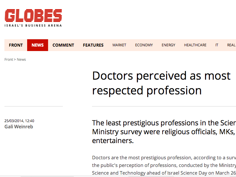 Reference: http://www.globes.co.il/en/article-doctors-perceived-as-most-respected-profession-1000927018