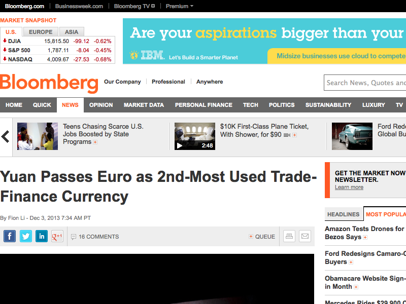 Reference: http://www.bloomberg.com/news/2013-12-03/yuan-passes-euro-to-be-second-most-used-trade-finance-currency.html